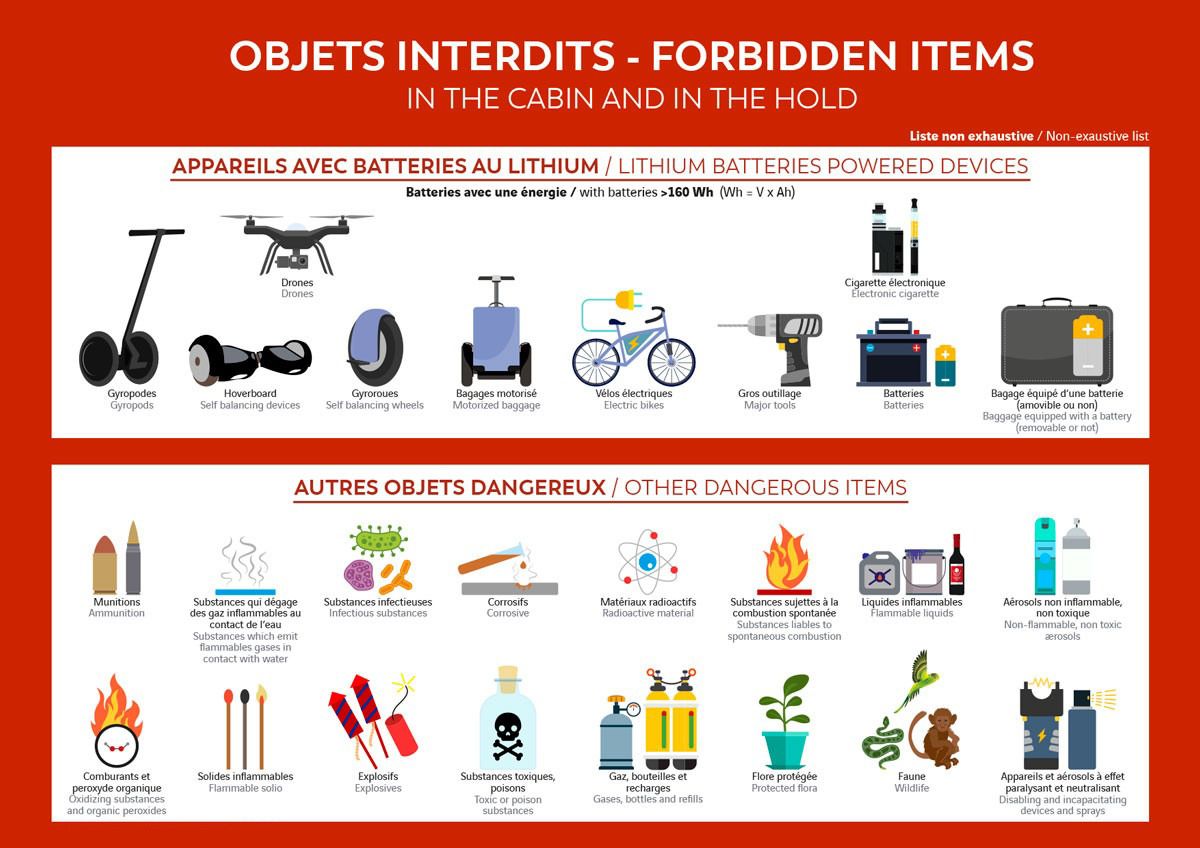 Les objets tranchants comme les ciseaux de plus de 6 cm, les couteaux, les tournevis, les armes et répliques, y compris les jouets imitant des armes, les produits inflammables et dangereux, y compris les feux d'artifice, les batteries au lithium de grande capacité, les solvants et les pesticides13 sont aussi prohibés.